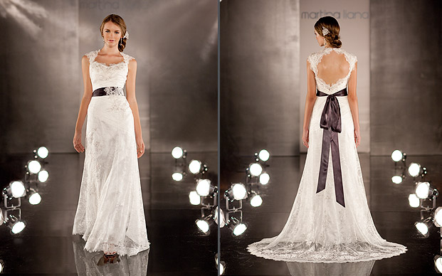 Brittney's dress will have a lace bodice and skirt, possibly a train, a silk sash around the waist that ties in the back. A lace applique at the waist that the sash threads through so that the sash shows through the lace. Like this: